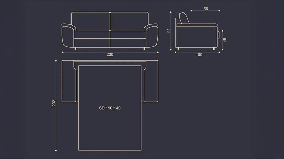 • Canapea 3L dimensiuni de gabarit: 220 x 100 cm ; (L x A x H) 220x 100 x 91 cm ; adancime sezut 56 cm. Suprafata de dormit 140x190 (saltea cu arcuri Bonell , H12 cm, recomandata pentru dormit noapte de noapte). Picior: plastic, H = 5 cm.