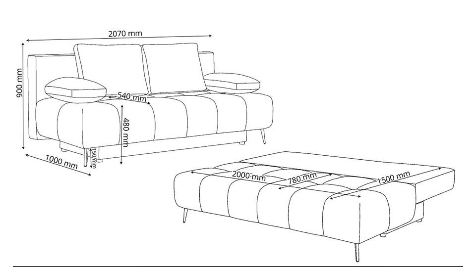 •  L 207 x A 100 x H 90 cm ( Spatiu extins 150 x 200 cm)
