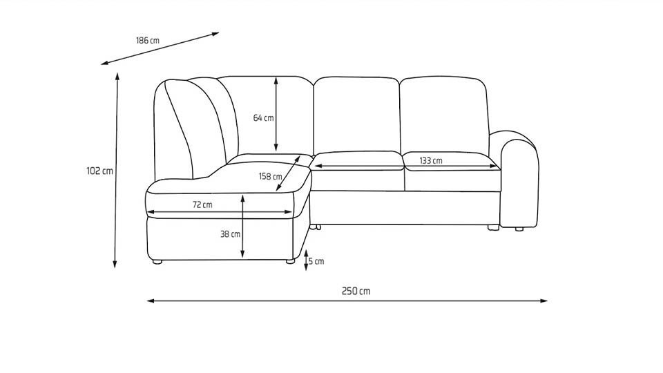 L - L x l x H 250 x 186 x 100 cm / 129 x 205 cm (spatiu pentru dormit)