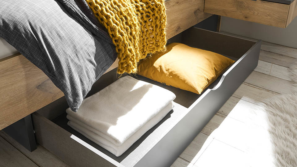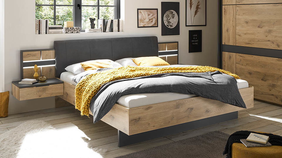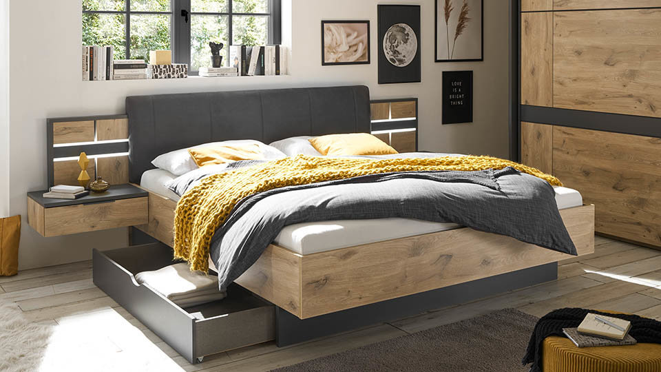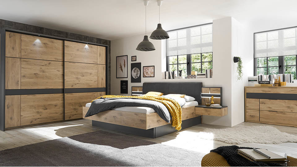 Dormitor Siano compus din dulap cu doua usi glisante, pat cu doua noptiere suspendate, optional comoda, sertare pat sau rama dulap.