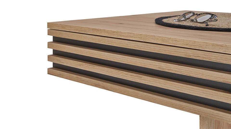 Masa realizata din pal melaminat + fete sertar riflaje din lemn.