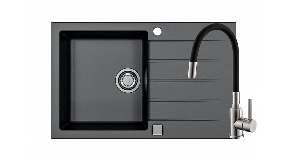 Alveus Cadit 20 este o chiuveta de bucatarie realizata din material compozit, granital. Este formata dintr-o cuva spatioasa, prevazuta cu picurator si are dimensiunea totala de 79 x 50 cm. Acest model de chiuveta Alveus este conceput pentru montajul pe blatul de bucatarie (incastrabil), fiind parte continua a suprafetei de lucru. Bateria Alveus Flexa este o baterie de tip monocomanda cucartus ceramic, pipa inalta si flexibila.