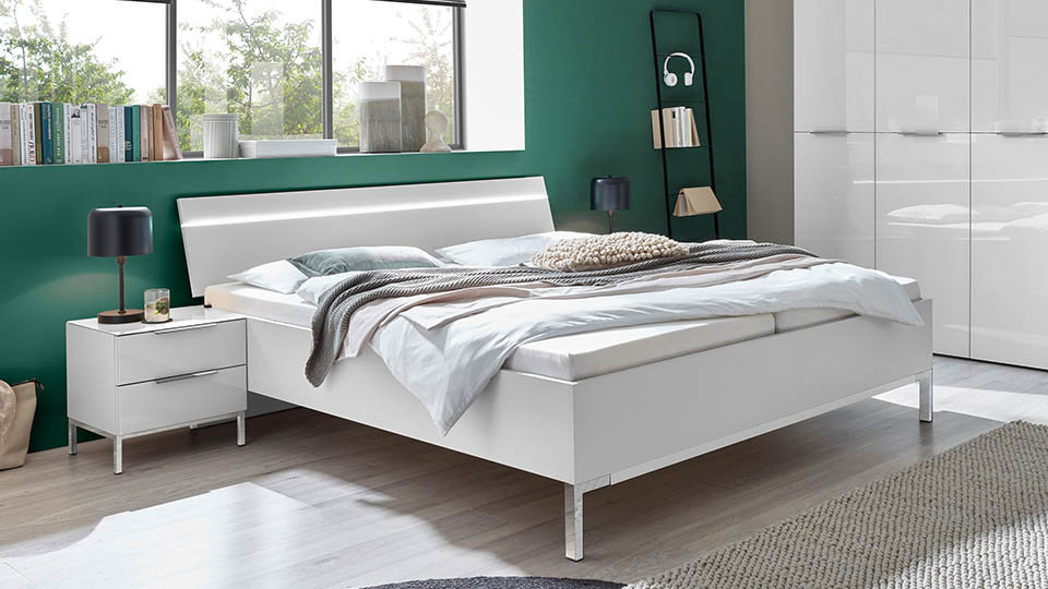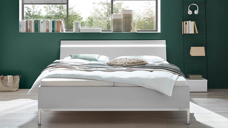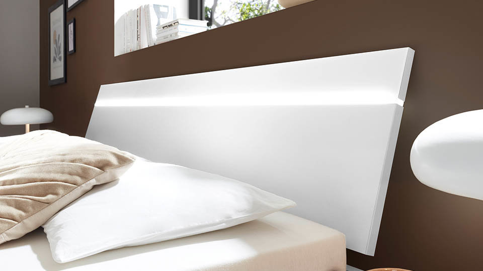Patul BARI completează un dormitor modern prin design simplu și finisaj alb luminos. Tăblia este evidențiată prin inserție din sticlă albă și iluminare integrată, care creează o lumină ambientală discretă, potrivită pentru seară.