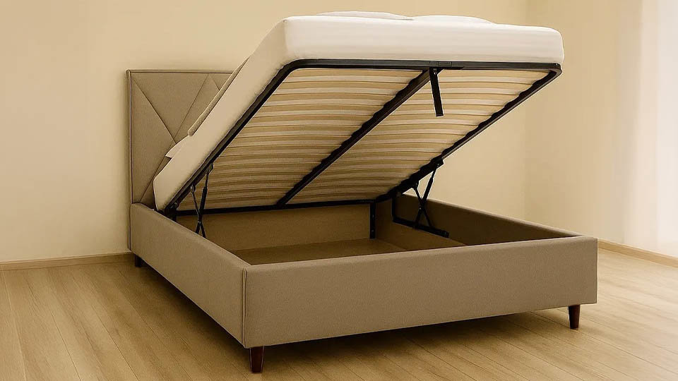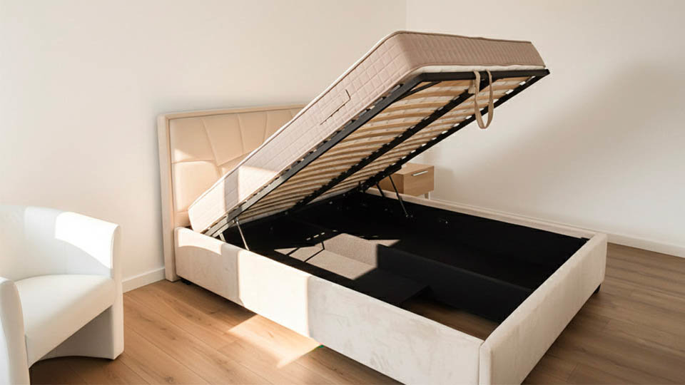 Pat tapitat prevazut cu suport metalic rabatabil, lada pentru depozitare, disponibil in 3 dimensiuni.