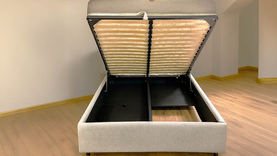 Pat tapitat prevazut cu suport metalic rabatabil, lada pentru depozitare, disponibil in 3 dimensiuni.
